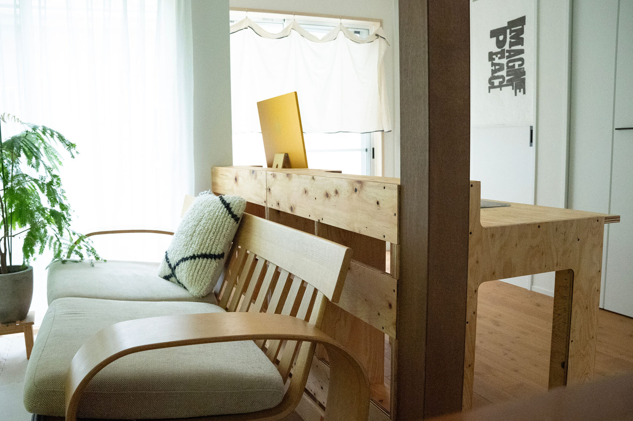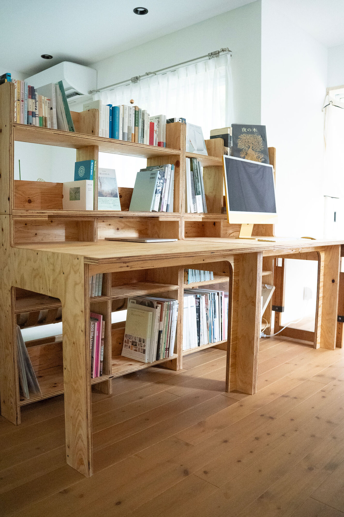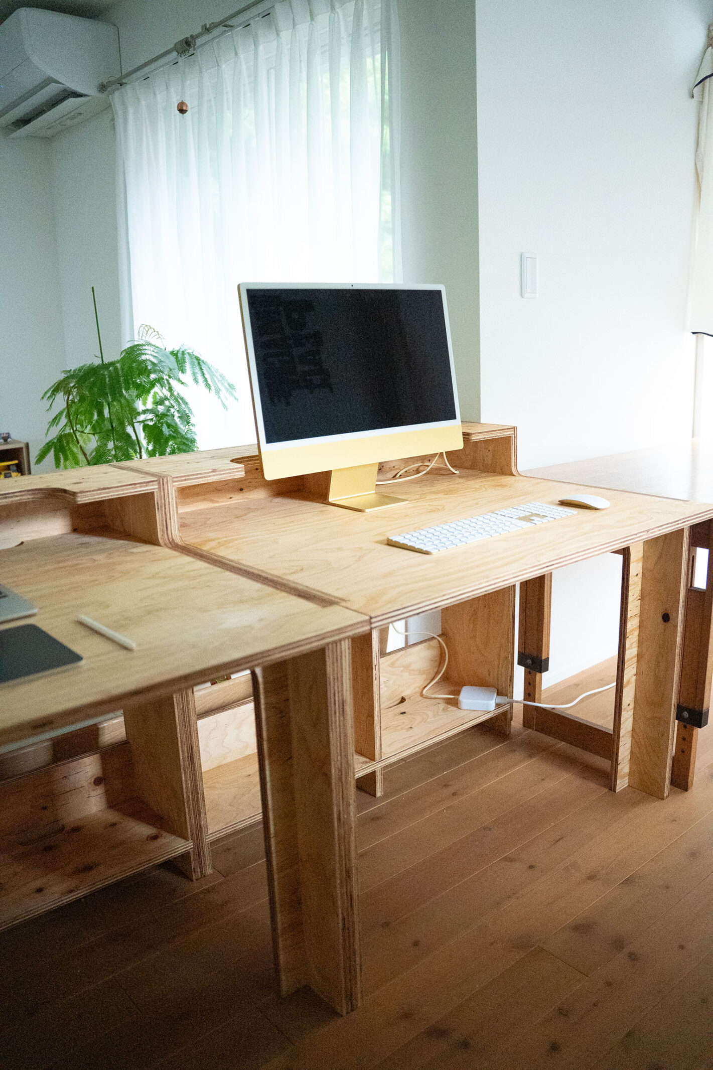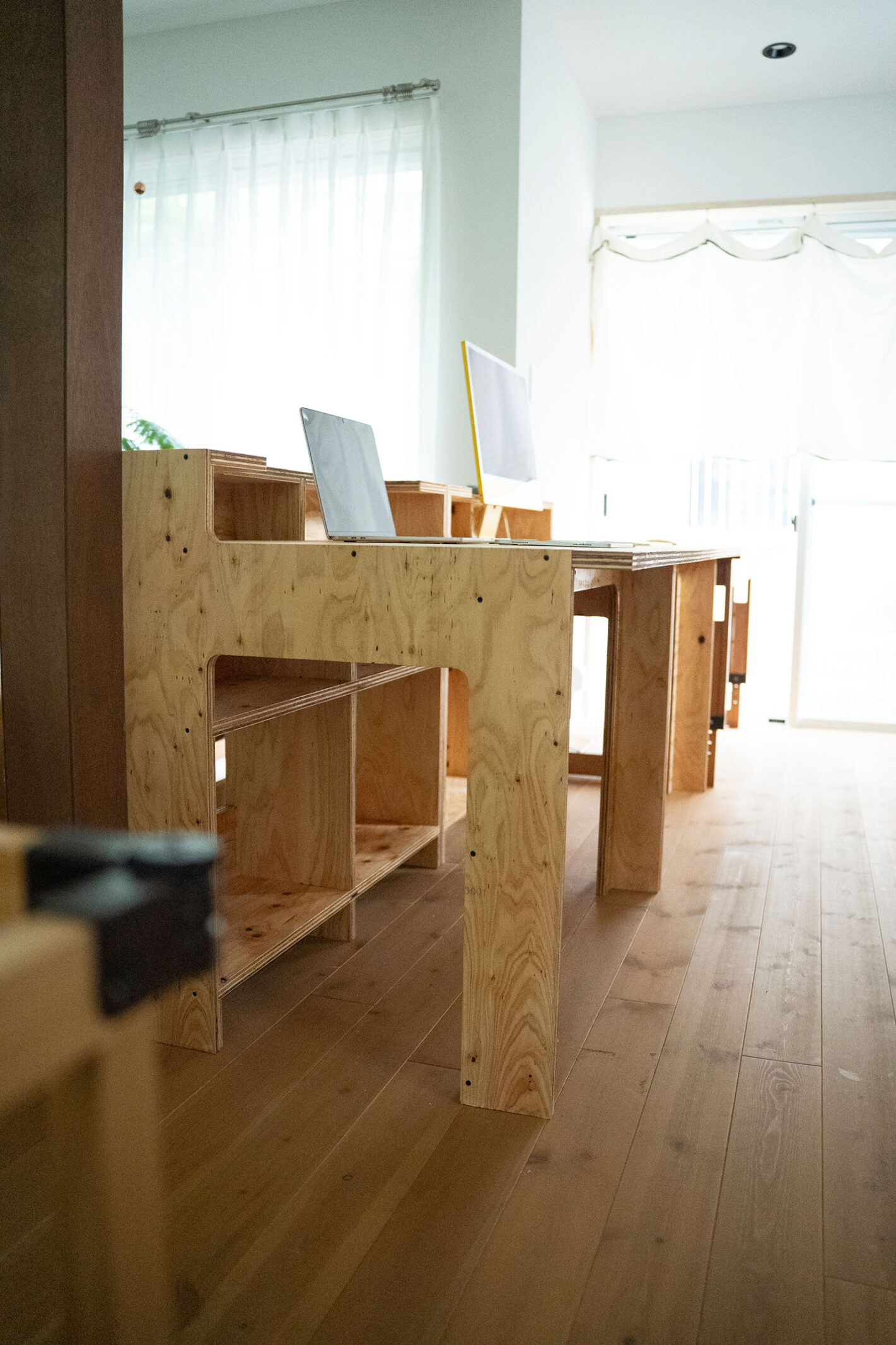 知人のグラフィックデザイナーYuki Okajimaと、その家族のための作業デスク。 これから大きく変わっていくであろう家族の生活に長く寄り添えるような設計とした。 全ての部材はオンラインでのカット加工サービスを利用し、夫婦にも参加してもらいながら自宅のベランダで組み立てていった。