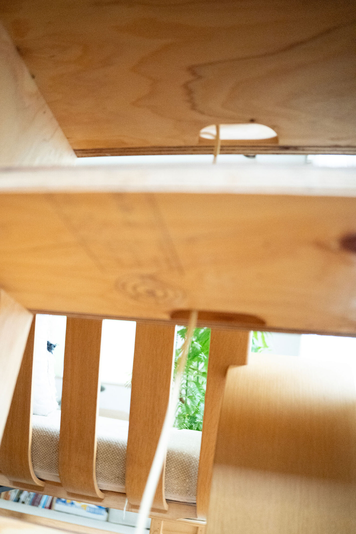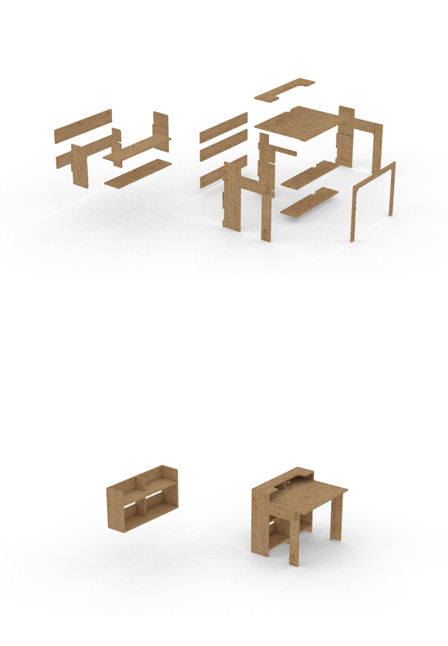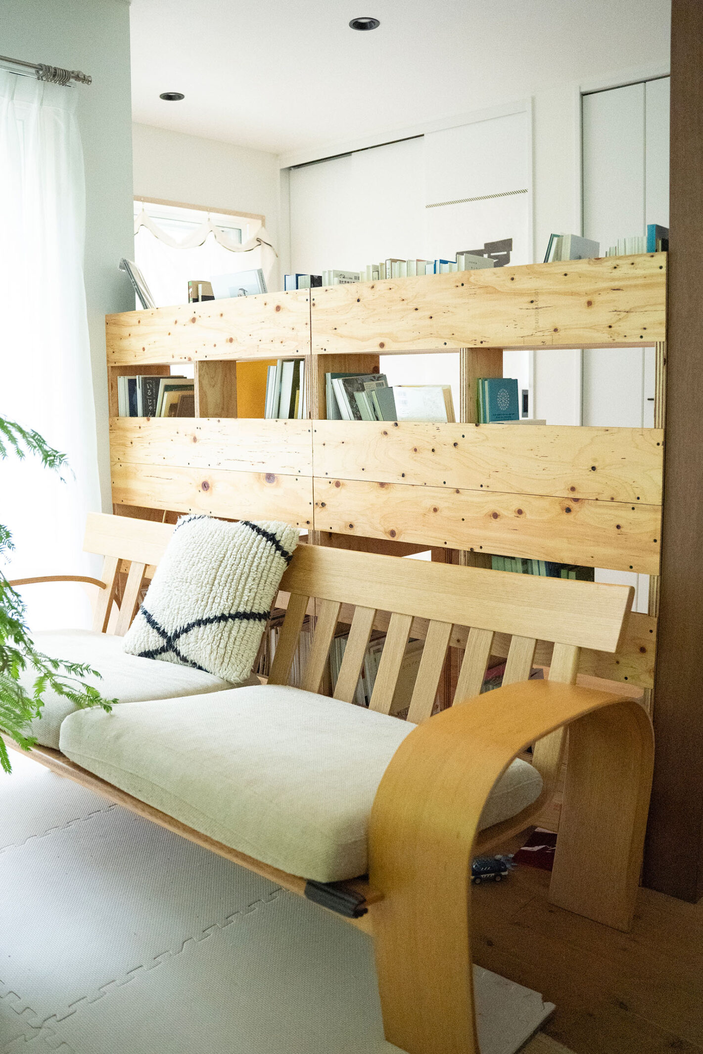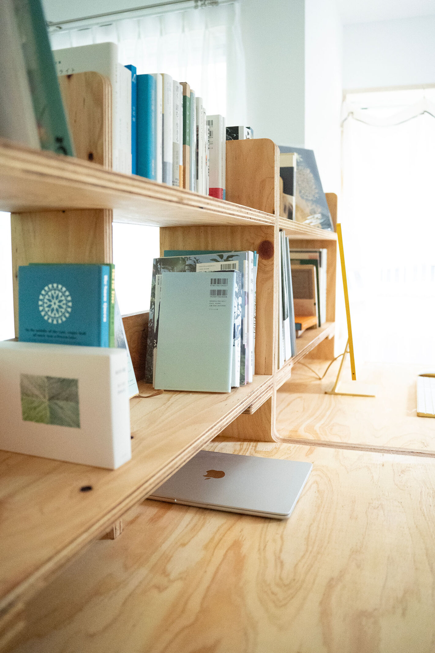 知人のグラフィックデザイナーYuki Okajimaと、その家族のための作業デスク。 これから大きく変わっていくであろう家族の生活に長く寄り添えるような設計とした。 全ての部材はオンラインでのカット加工サービスを利用し、夫婦にも参加してもらいながら自宅のベランダで組み立てていった。