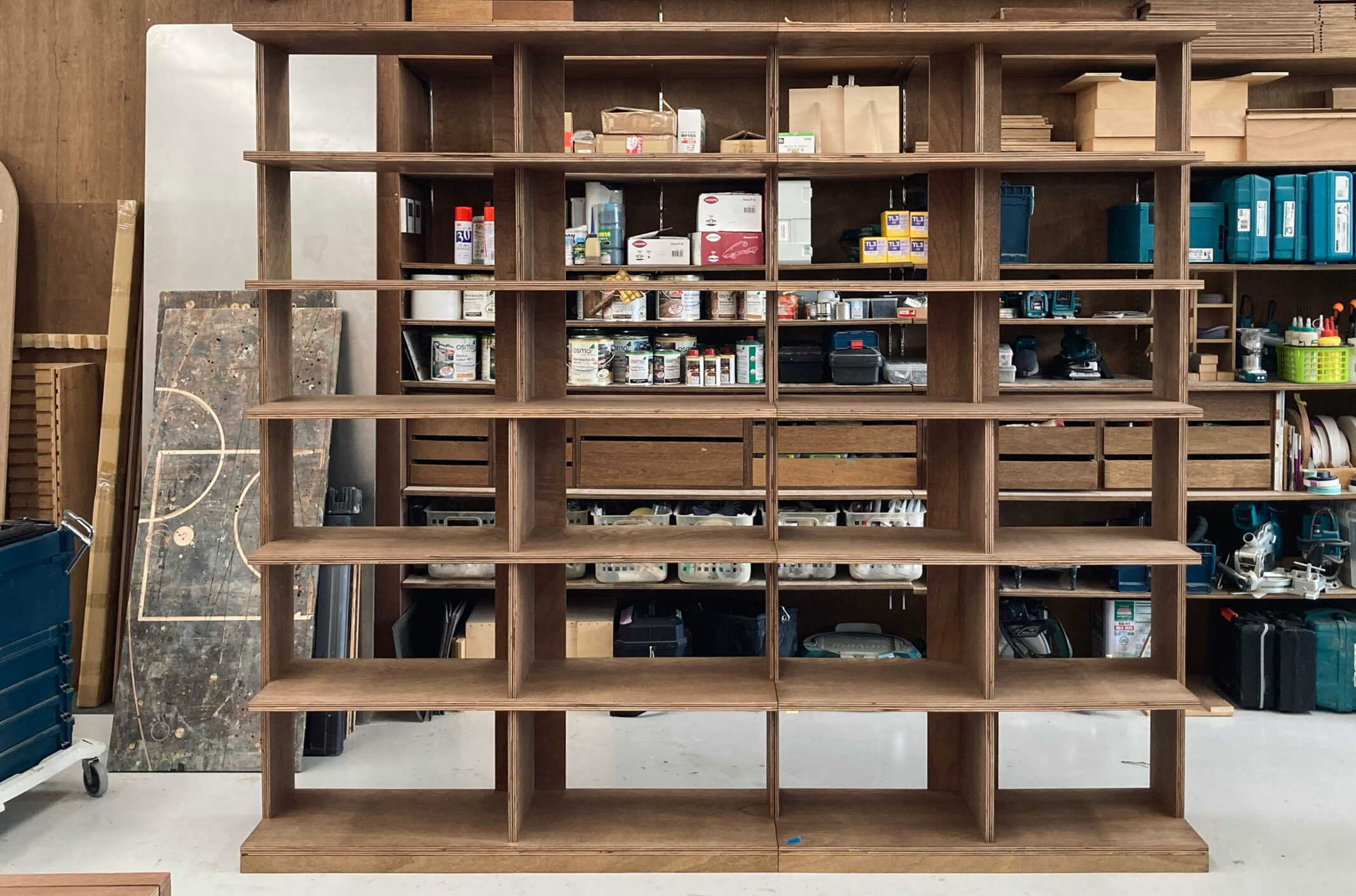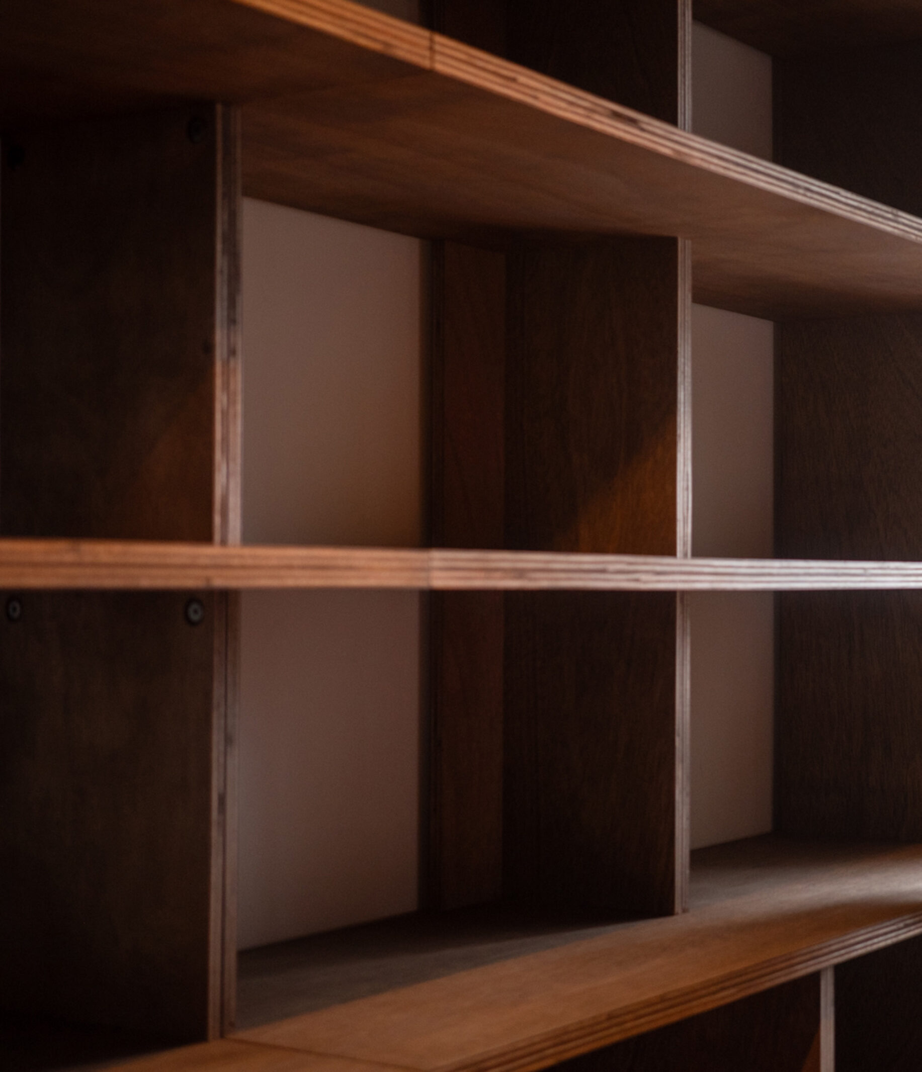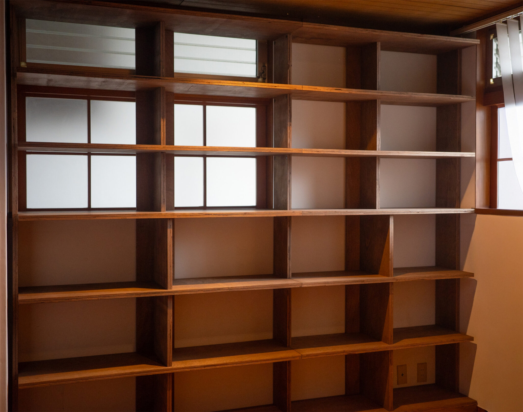 オブジェとしての本をコレクションしているプライベートギャラリー、少部数限定の出版社でもある「FRAGILE BOOKS」の事務所内の特注本棚。